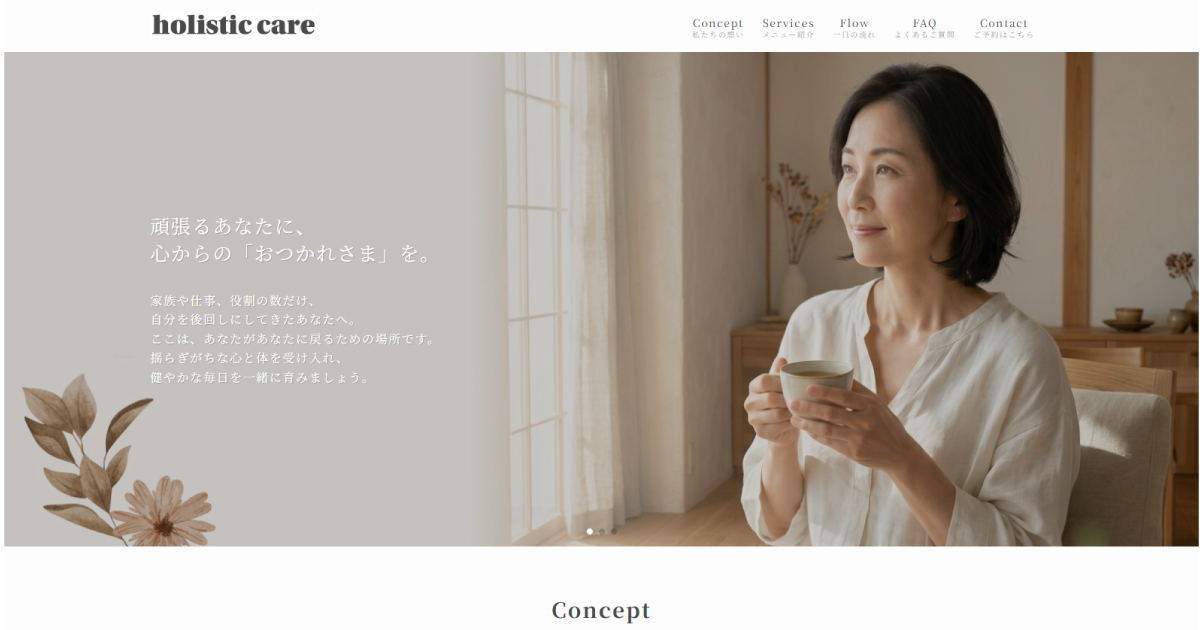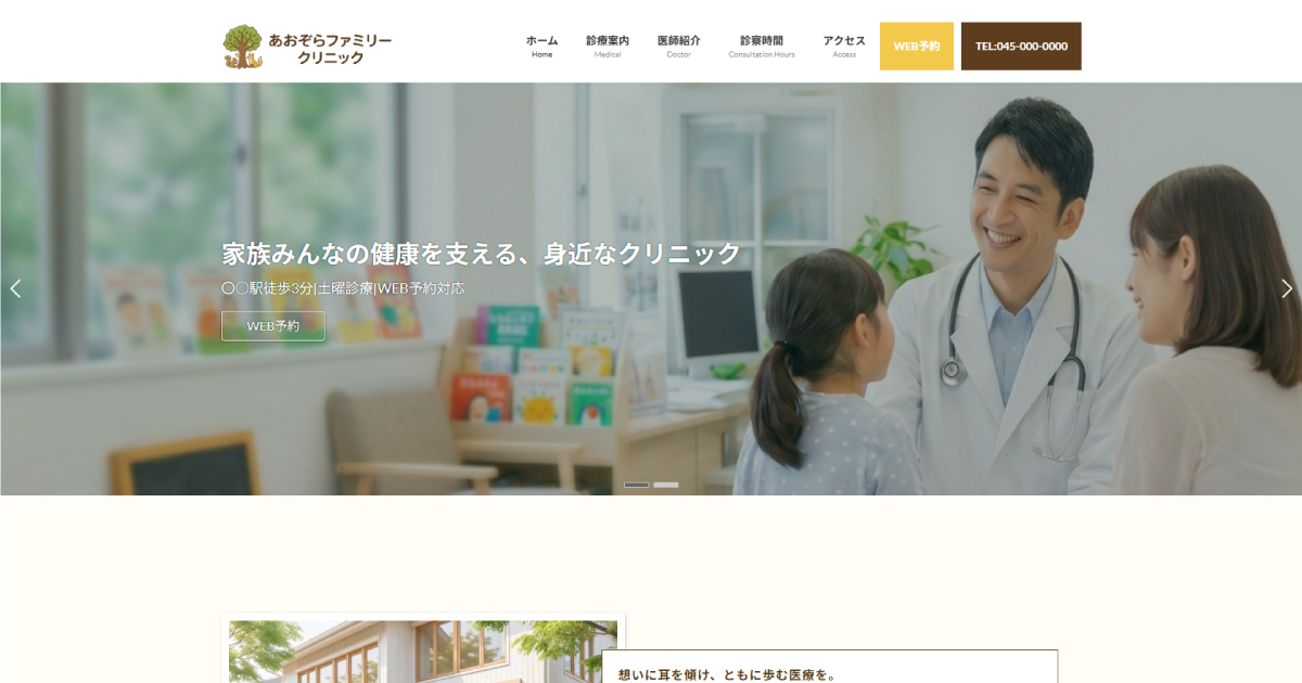 サイトタイトルを「あおぞらファミリークリニック」と設定したデモサイトです。診療内容ごとにユーザー心理(不安・信頼・行動)を考慮したデザインにしました。予約につながる導線設計も意識しています。全体的に温かみのある優しい雰囲気に仕上げました。画...